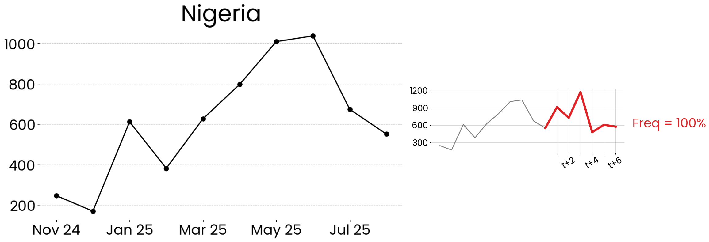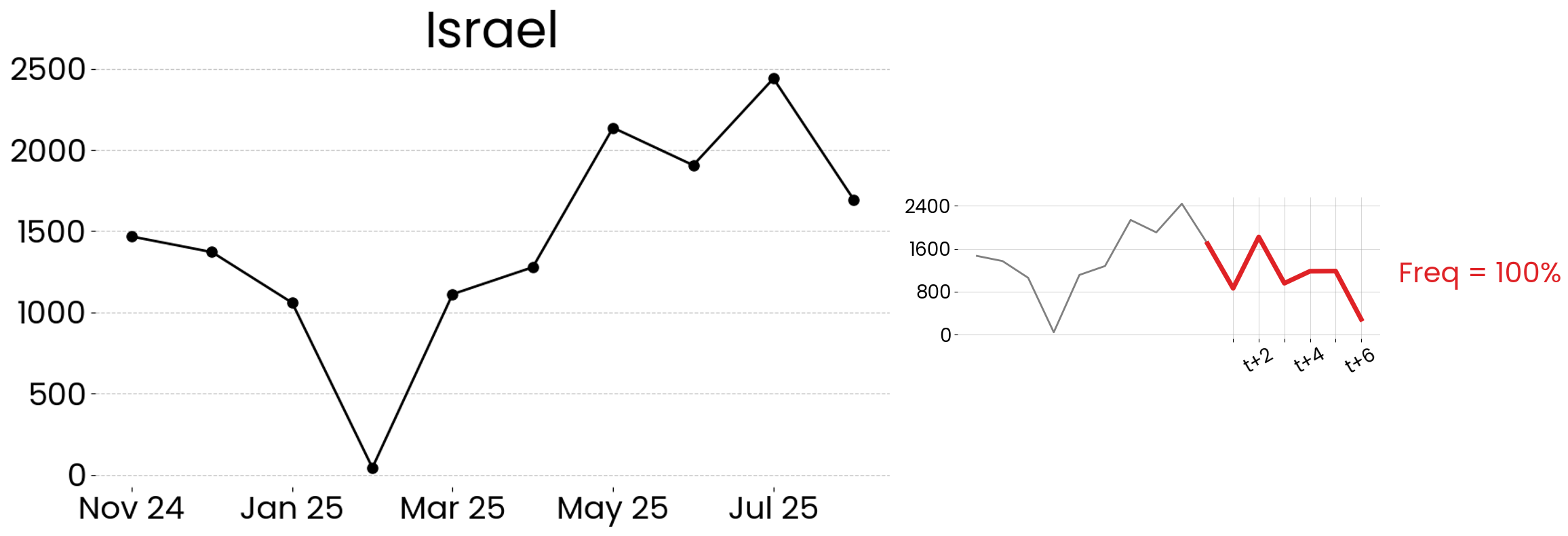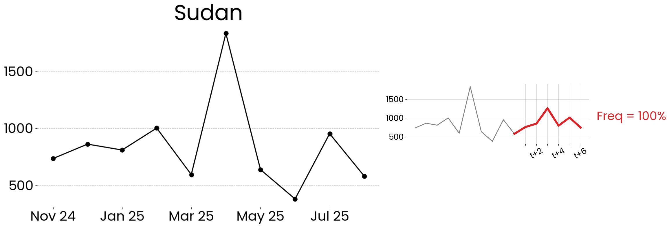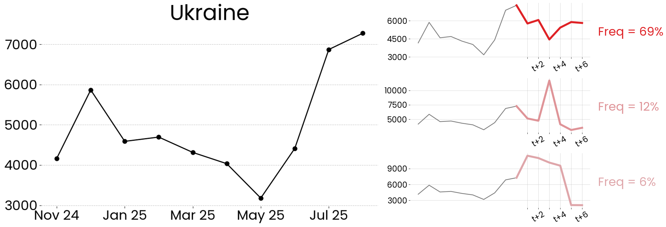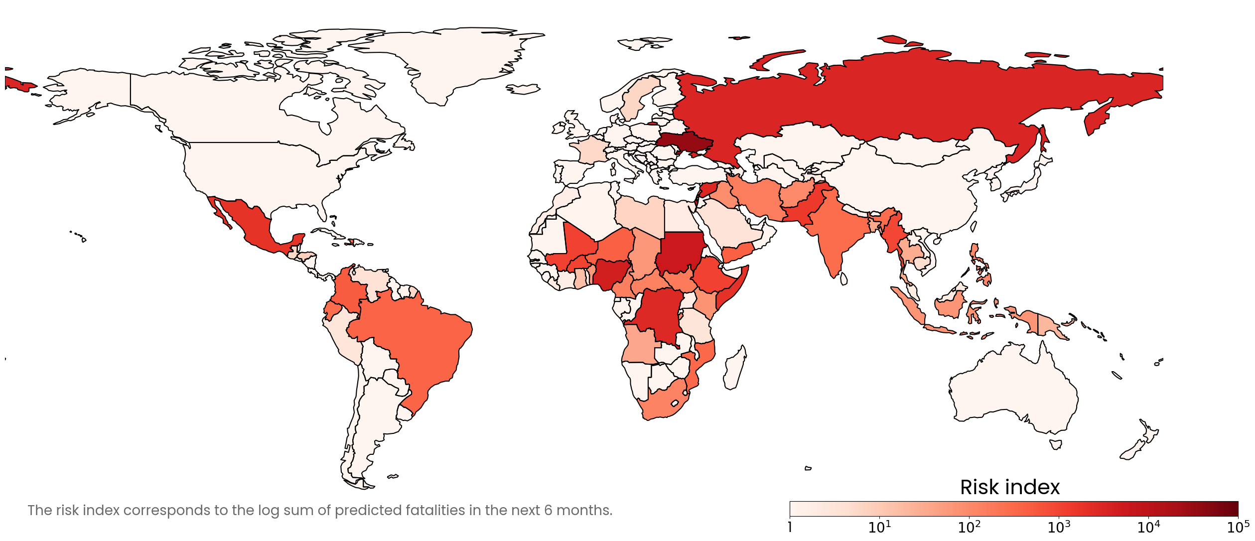Our Global Risk Prediction Map identifies countries with similar past experiences in conflict-related fatalities. By analyzing historical data patterns, this approach forecasts future trends and highlights nations with comparable conflict trajectories.